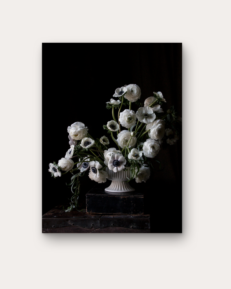 Moody blacks and soft whites, this bouquet featuring anemones Bianco and Bianco Center Nero with ranunculus Bianco offers elegance and beauty to any space.