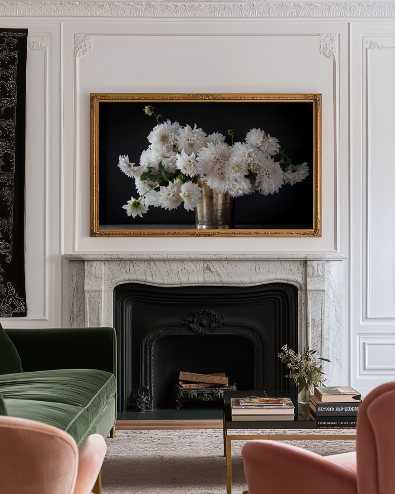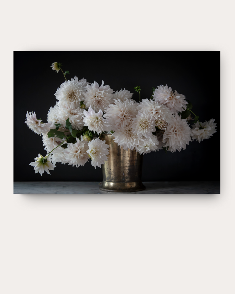 Stunning dahlias cascading out of a brass vase.