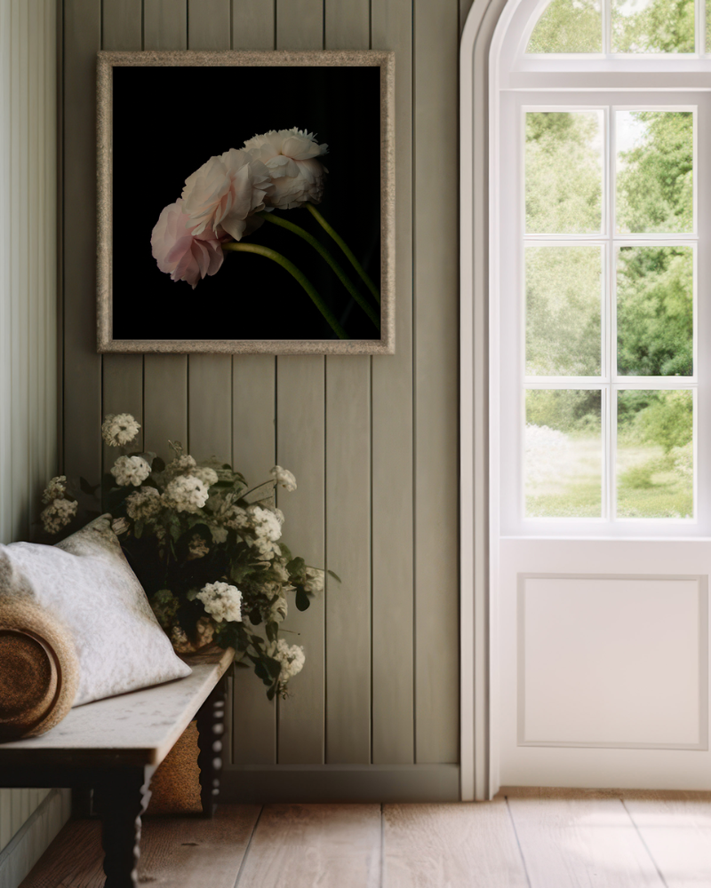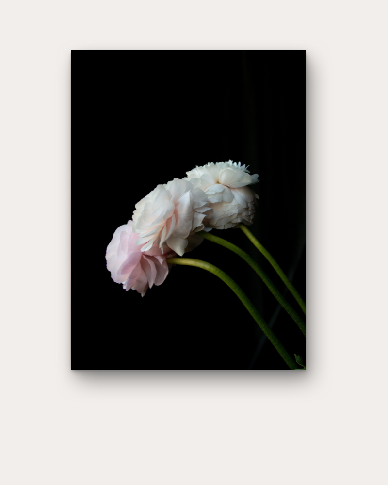 Our Italian ranunculus Rosa Chiaro offset in negative space.