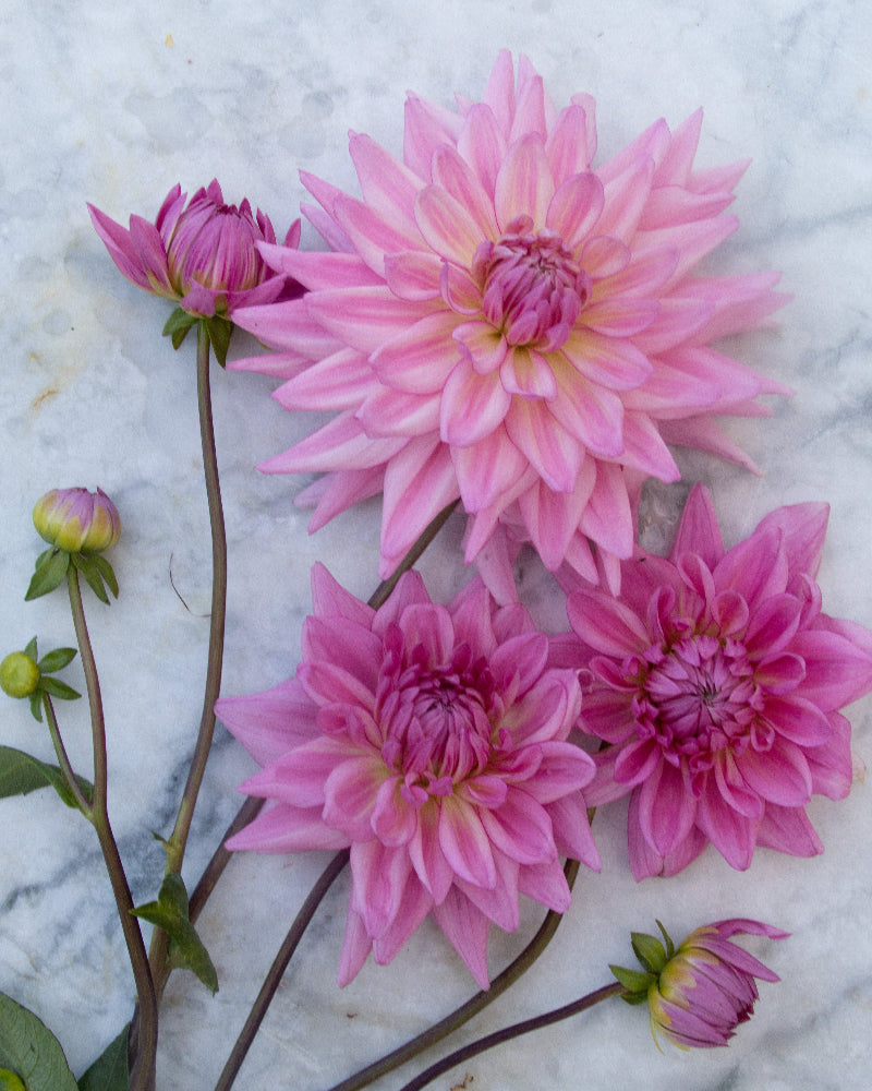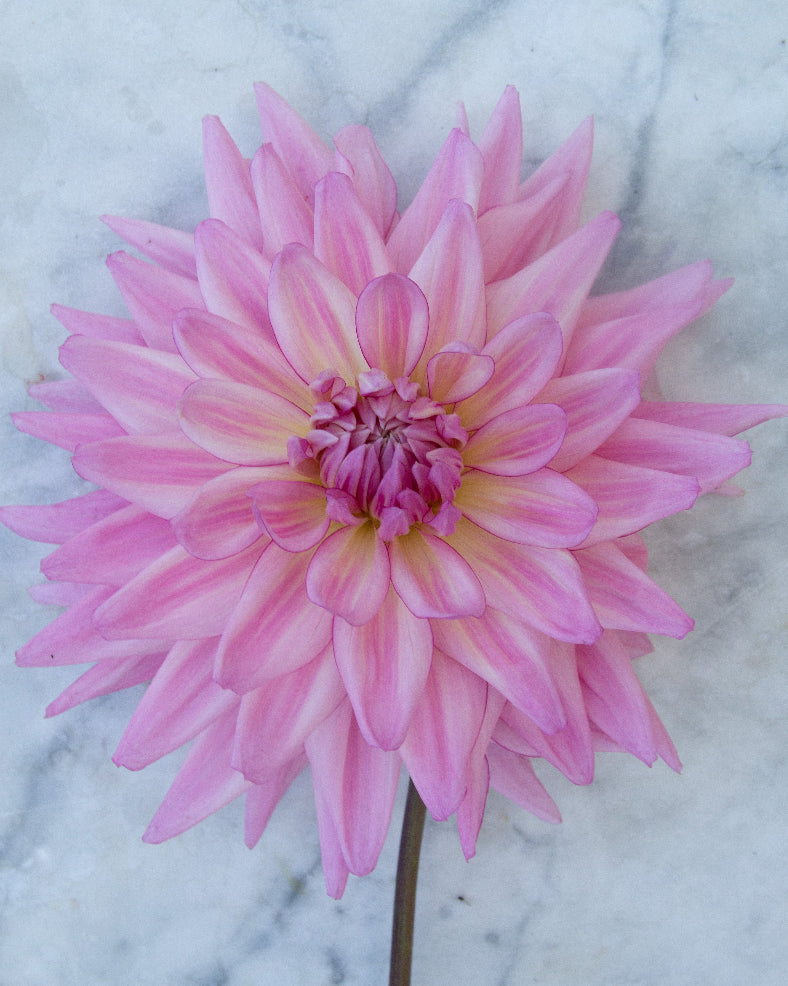 Long incurving petals create a joyous explosion of warm lavender-pink blooms. Many of the scooping petals are edged with a darker fuchsia, while some are also striated with this dark pink.